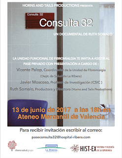 Me gustaría compartir con vosotros la proyección de un documental sobre enfermedad de fibromialgia, "CONSULTA 32", en el que he participado, en colaboración con la Unidad de Fibromialgia del Hospital de La Ribera y la Productora norteamericana Horns&Tails Production, con el objetivo de aumentar la visibilidad de esta enfermedad y poner de manifiesto el sufrimiento de este tipo de pacientes.